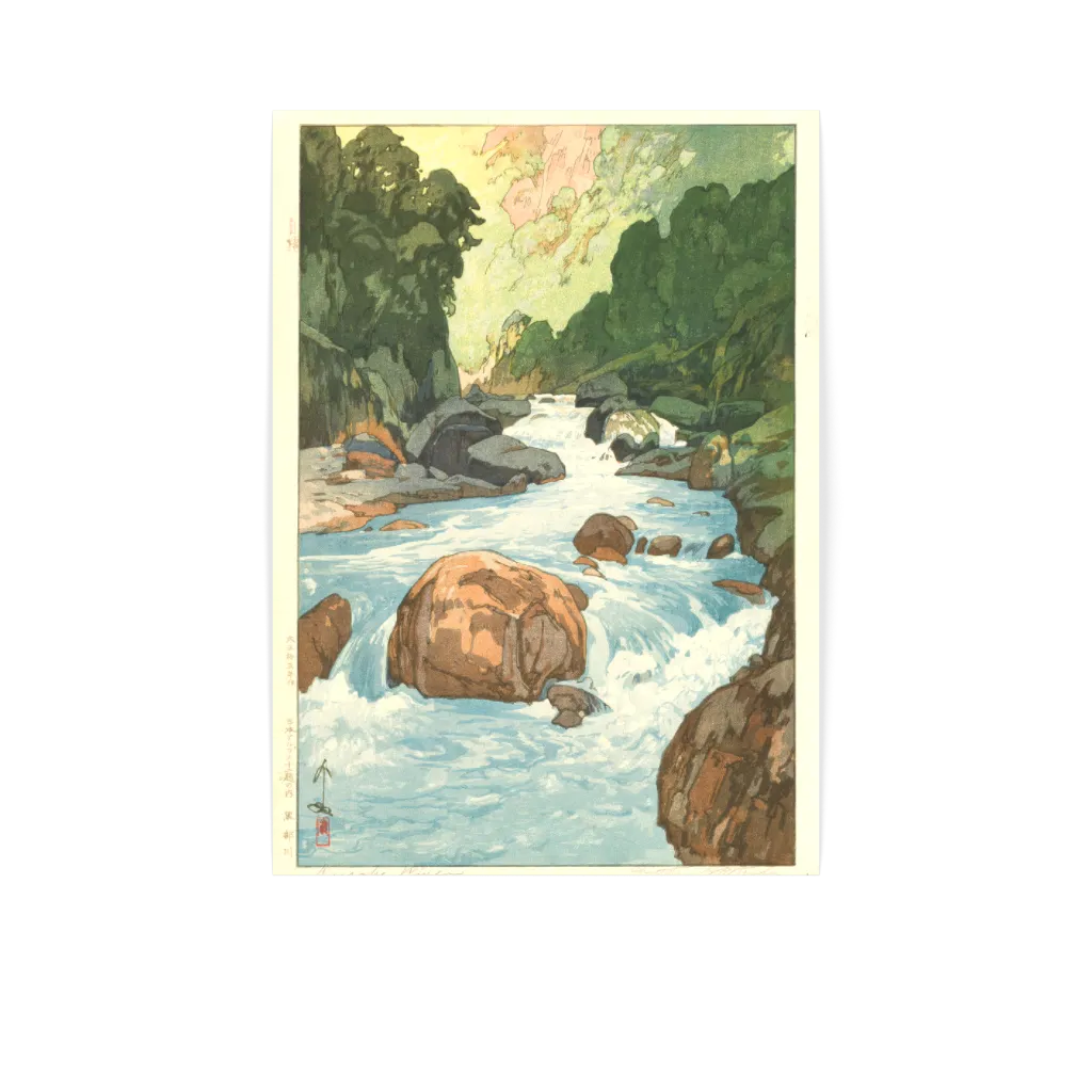 Hiroshi Yoshida, ein Meister der japanischen Holzschnittkunst, schuf 1926 das beeindruckende Werk "Kurobe River". Dieses Kunstwerk fängt die majestätische Schönheit des Kurobe-Flusses in Japan ein, mit seinen klaren, fließenden Wassern und den umgebenden, üppigen Landschaften. Yoshidas Technik, die subtile Farbverläufe und feine Details kombiniert, verleiht dem Werk eine fast meditative Qualität. Seine Fähigkeit, die Essenz der Natur einzufangen, macht seine Werke zeitlos und universell ansprechend.