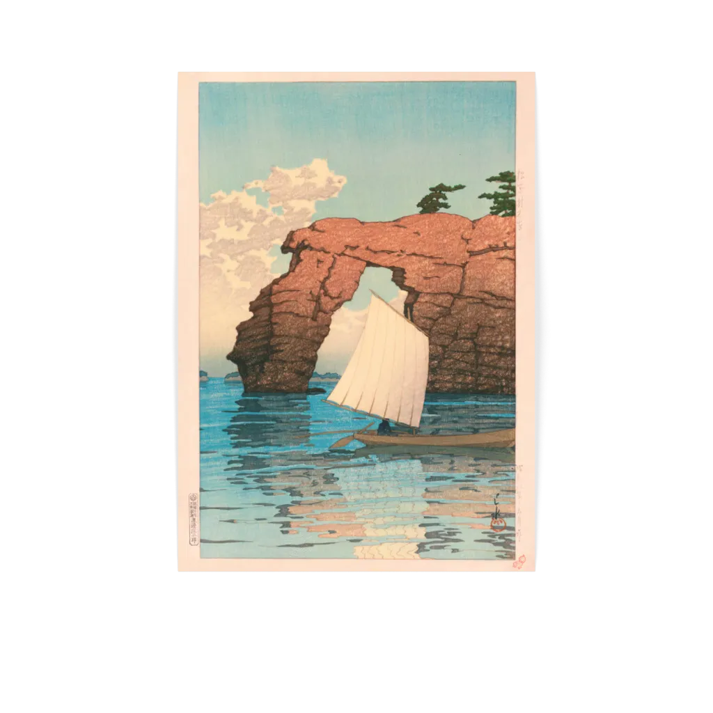 "Segelboot" (1933) von Hasui Kawase ist ein faszinierendes Kunstwerk, das die ruhige und doch dynamische Schönheit der traditionellen japanischen Landschaftsmalerei einfängt. Dieses Werk zeigt ein einsames Segelboot, das sanft auf den ruhigen Gewässern eines japanischen Sees oder Flusses treibt. Die Darstellung des Wassers, mit feinen Linien und subtilen Farbübergängen, vermittelt ein Gefühl von Bewegung und Stille zugleich. Der Himmel im Hintergrund, möglicherweise im frühen Morgen- oder späten Abendlicht, ergänzt die Szene mit sanften Farbtönen, die die friedliche Atmosphäre verstärken. Kawase ist bekannt für seine Fähigkeit, die Stimmungen der Natur durch seine meisterhafte Beherrschung der traditionellen japanischen Holzschnitttechnik einzufangen.