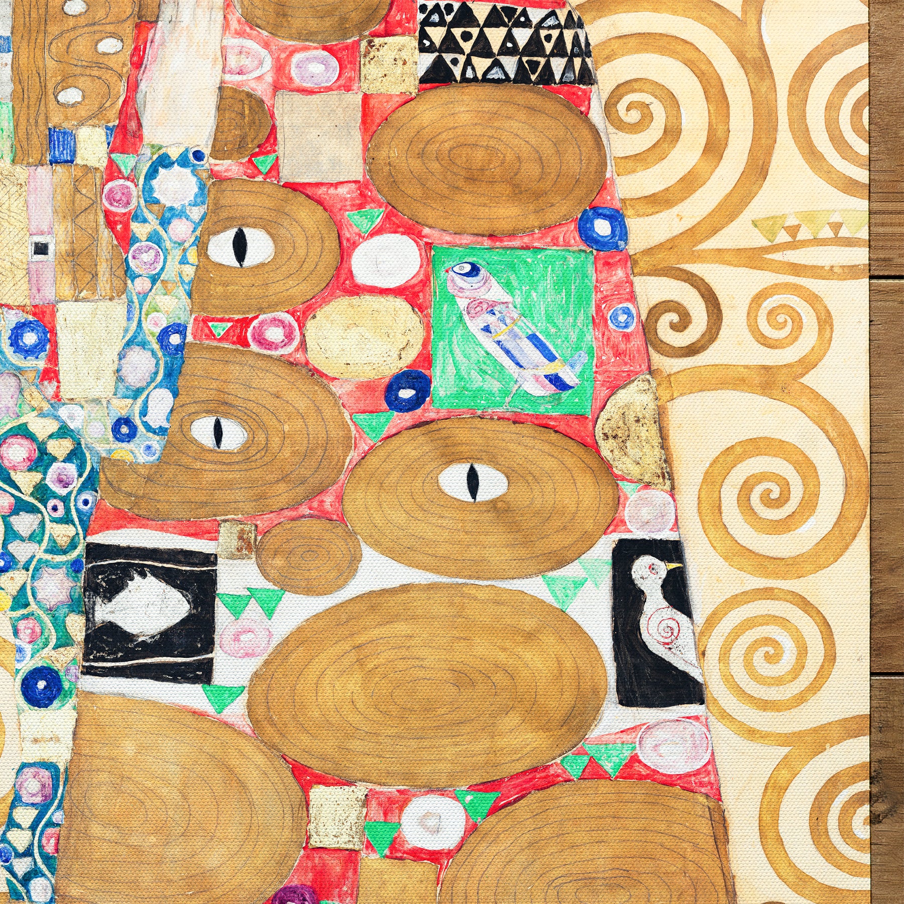 Gustav Klimts Wandgemälde für den Speisesaal des Stoclet Palais bestand aus 9 Teilen. Dies ist einer der neun Teile. Die opulente Komposition, die zwischen 1905 und 1911 entstanden, zeigen Klimts unverwechselbaren Stil, der dekorative Elemente mit einer tiefen emotionalen Resonanz verbindet. Die Verwendung von Gold und die komplexen Muster verleihen dem Gesamtwerk eine fast byzantinische Pracht, während die Figuren in ihrer Anmut und Eleganz zeitlos erscheinen. Dieses Werk ist ein Paradebeispiel für Klimts Fähigkeit, Kunst und Architektur nahtlos zu verbinden, und es bleibt ein faszinierendes Zeugnis seiner künstlerischen Vision.