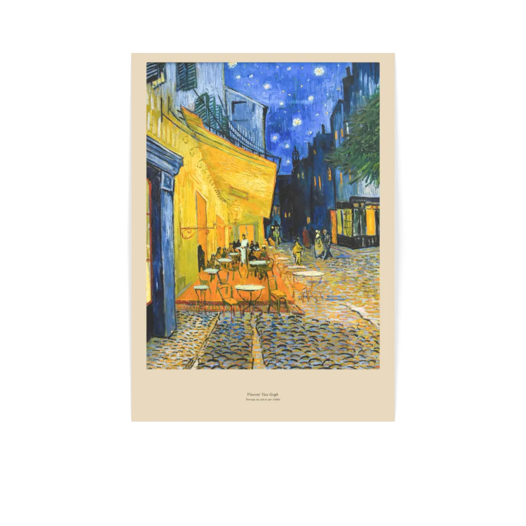 Vincent van Gogh's "Terrasse du Café le Soir" von 1888 ist ein leuchtendes Meisterwerk, das die nächtliche Atmosphäre eines Cafés in Arles, Frankreich, einfängt. Mit seinen lebendigen Gelbtönen und dem charakteristischen Sternenhimmel zeigt das Gemälde Van Goghs einzigartige Fähigkeit, Licht und Farbe zu verschmelzen. Die Szene ist voller Leben, mit Menschen, die sich unterhalten und die warme Nacht genießen. Van Gogh schuf dieses Werk während einer besonders produktiven Phase seines Lebens, in der er von der südfranzösischen Landschaft und dem Licht fasziniert war.
